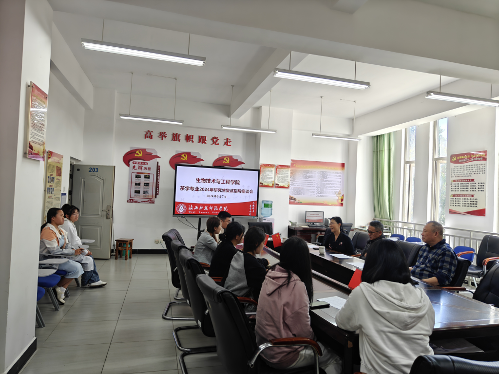 3月7日,生物技术与工程学院组织2024年茶学专业研究生复试指导座谈会。西南大学茶学专业银龄教授龚正礼、杨坚,茶学专业负责人王绍梅教授,20级茶学班班主任、辅导员、专业教师和研究生复试学生参加座谈会。